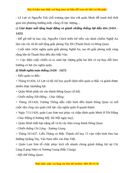Đây là bản xem th , vu ử i lòng mua tài li u ệ đ xe ể m chi ti t (c ế ó l i ờ gi i ả ) Bài 16. Kh i ở nghĩa Lam S n ( ơ 1418 - 1427) 1. M t ộ s s ố ự ki n t ệ iêu bi u c ể a kh ủ i ở nghĩa Lam S n ơ a) Lê L i ợ d ng c ự k ờ h i ở nghĩa - B t ấ bình trư c ớ chính sách cai tr c ị a ủ nhà Minh, ngư i ờ Vi t ệ n i ổ d y ậ đ u ấ tranh ở nhi u n ề i ơ song đ u t ề hất b i ạ . - Lê L i ợ - m t ộ hào trư ng ở ở vùng đ t ấ Lam S n ơ tích c c ự xây d ng ự l c ự lư ng, ợ d ng c ự ờ kh i