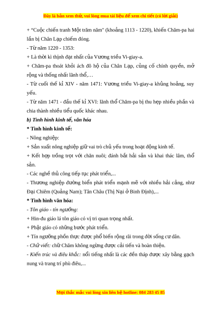 Đây là bản xem th , vu ử i lòng mua tài li u ệ đ xe ể m chi ti t ế (có l i ờ gi i ả ) + “Cu c ộ chi n ế tranh M t ộ trăm năm" (kho ng ả 1113 - 1220), khi n ế Chăm-pa hai lần bị Chân L p chi ạ m ế đóng. - T năm ừ 1220 - 1353: + Là th i ờ kì th nh đ ị t ạ nh t ấ c a ủ Vư ng t ơ ri u ề Vi-giay-a. + Chăm-pa thoát kh i ỏ ách đô hộ c a ủ Chân L p, ạ c ng ủ cố chính quy n, ề mở r ng và t ộ hống nhất lãnh thổ,… - Từ cu i