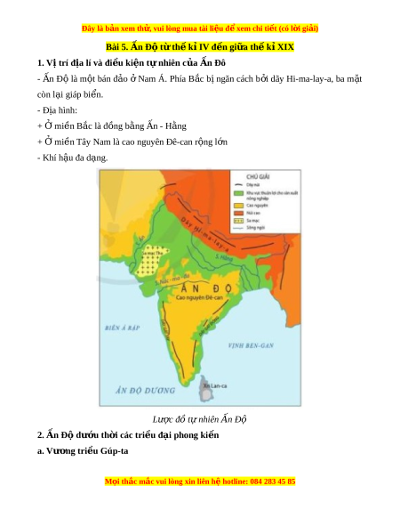 Đây là bản xem th , vu ử i lòng mua tài li u ệ đ xe ể m chi ti t (c ế ó l i ờ gi i ả ) Bài 5. Ấn Đ t ộ t ừ h k ế I ỉ V đ n gi ế a t ữ h k ế X ỉ IX 1. V t ị rí đ a l ị í và đi u ki ề n t ệ nhi ự ên c a ủ n Đ Ấ ô - n  Рô la m t ô ban đ o a ơ Nam A. Phia B c ă b ingăn cach b i ơ day Hi-ma-lay-a, ba m t ă con l i a giap bi n. ê - Đia hình: + m Ở i n B ề c l ă a đ ng b ồ ng ằ n -  H ng ằ + m Ở i n