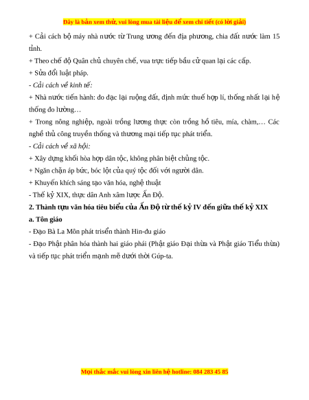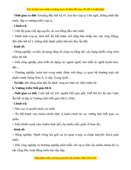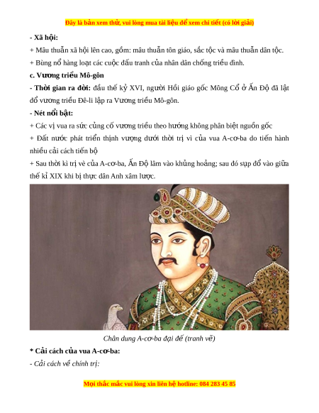 Đây là bản xem th , vu ử i lòng mua tài li u ệ đ xe ể m chi ti t (c ế ó l i ờ gi i ả ) - Xã h i ộ : + Mâu thu n xa h â i ô lên cao, g m ồ : mâu thu n t â ôn giao, s c ă t c va m ô âu thu n dân t â c. ô + Bung n hang l ổ o t a cac cu c ô đ u t â ranh c a ủ nhân dân ch ng t ô ri u ề đình. c. Vư ng t ơ ri u Mô ề -gôn - Th i ờ gian ra đ i ờ : đâu th ê k y XVI, ngư i ờ H i ồ giao g c ô Mông Cổ ơ n  Đô đa l t â đổ vư ng t ơ ri u Đ ề ê-li l p r â a Vư ng ơ tri u M ề ô-gôn. - Nét n i ổ b t ậ : + Cac v vua r i a s c c ứ ng ủ c v ô ư ng t ơ ri u
