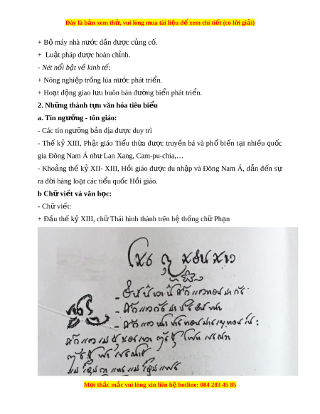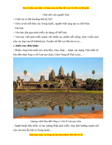 Đây là bản xem th , vu ử i lòng mua tài li u ệ đ xe ể m chi ti t (c ế ó l i ờ gi i ả ) Ch vi ữ t ế c a ng ủ ư i ờ Thái + Ch L ữ ao ra đ i ờ kho ng ả th k ê X y IV + Trên c s ơ ch ơ H ữ an c a ủ Trung Qu c, ng ô ư i ờ Vi t ệ sang t o r a a ch N ữ ôm. - Văn h c: ọ + Văn h c dân ọ gian phat tri n, đa d ê ng a v t ề h l ê o i a . + Văn h c ọ vi t ê phat tri n ê m nh a v i ơ nhi u ề tac ph m ẩ n i ô ti ng, ê nh : ư Cu n ô sach c a ủ cac ông vua ( I ơ nđônêxia); Truyện s M ư a Lai (Ma-lai-xi-a)… c. Ki n t ế ruc-điêu kh c ắ : - Nhi u ề công trinh ki n ê trúc nh ư đ n, ề chùa, thap… đư c ợ xây d ng. ự Tiêu bi u ê la: khu đ n t ề hap Ăng-co ( C ơ am-pu-chia); Chùa Vang ( ơ Thai Lan);… Quang c nh ả khu đ n Ă ề ng-co Vát C ở am-pu-chia - Ngh ệ thu t ậ điêu kh c ă va t c a tư ng ợ Ph t ậ phat tri n, ê ch u ị nh ả hư ng ơ m nh a me c a ủ văn hoa n Đ Â va ộ Trung Quôc… M i