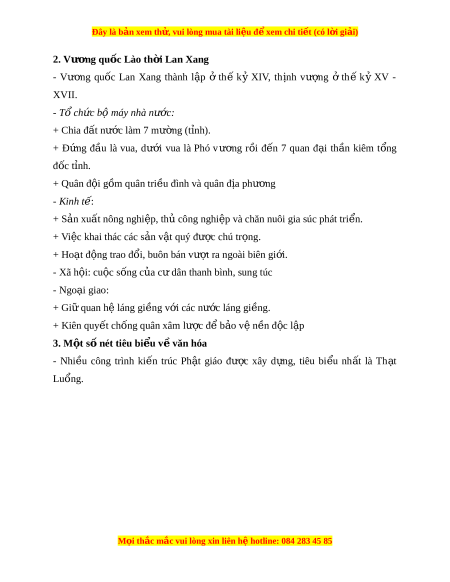 Đây là bản xem th , vu ử i lòng mua tài li u ệ đ xe ể m chi ti t (c ế ó l i ờ gi i ả ) 2. Vư ng qu ơ c ố Lào th i ờ Lan Xang - Vư ng ơ qu c ố Lan Xang thanh l p ậ ở th ế k y XIV, th nh ị vư ng ợ ở th ế k y XV - XVII. - Tô ch c ư b m ộ ay nhà nư c: ơ + Chia đ t â nư c ơ lam 7 mư ng ( ờ t nh ỉ ). + Đ ng ư đ u ầ la vua, dư i ơ vua la Phó vư ng ơ r i ô đ n ế 7 quan đ i ạ th n ầ kiêm t ng ổ đốc tỉnh. + Quân đ i ộ g m ô quân tri u đi ê nh va quân đ a ph ị ư ng ơ - Kinh tê: + S n ả xu t â nông nghi p, t ệ h công nghi ủ p va chăn nuôi ệ gia súc phát tri n. ể + Vi c khai ệ thác các s n v ả t ậ quy đư c chú t ợ r ng. ọ + Ho t ạ đ ng t ộ rao đ i ổ , buôn bán vư t ợ ra ngoai biên gi i ơ . - Xã h i ộ : cu c ộ s ng c ố a c