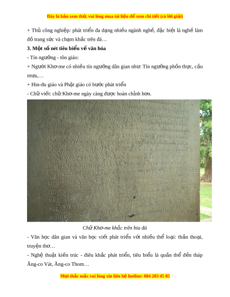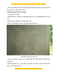Đây là bản xem th , vu ử i lòng mua tài li u ệ đ xe ể m chi ti t (c ế ó l i ờ gi i ả ) + Thủ công nghi p ê : phat tri n ê đa d ng a nhi u ề nganh ngh , ề đ c ă bi t ê la nghề lam đồ trang s c va ứ ch m a kh c ắ trên đa… 3. M t ô s net ố tiêu bi u v ể văn hóa ê - Tín ngư ng - ỡ tôn giao: + Ngư i ơ Kh - ơ me co nhi u ề tín ngư ng ỡ dân gian nh : ư Tín ngư ng ỡ ph n ồ th c, ự c u â m a,… ư + Hin-đu giao va Ph t â giao co bư c phat ơ tri n ê - Ch vi ữ t ê : chữ Kh - ơ me ngay cang đư c ơ hoan ch nh h ỉ n. ơ Ch K ữ h - ơ me kh c ắ trên bia đá - Văn h c ọ dân gian va văn h c ọ vi t ê phat tri n ê v i ơ nhi u ề thê lo i a : th n â tho i a , truy n t ê h … ơ - Nghê thu t â ki n ê trúc - điêu kh c ắ phat tri n, ê tiêu bi u ê la qu n â thê đ n ề thap Ăng-co Vat, Ăng-co Thom… M i