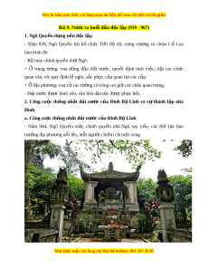Đây là bản xem th , vu ử i lòng mua tài li u ệ đ xe ể m chi ti t (c ế ó l i ờ gi i ả ) Bài 9. Nư c ớ ta bu i ổ đ u đ ầ c l ộ p ( ậ 939 - 967) 1. Ngô Quy n d ê ng n ư n đ ê c ộ l p ậ - Năm 939, Ngô Quy n ề bãi bỏ ch c ứ Ti t ế độ s , ứ x ng ư vư ng ơ và ch n ọ Cổ Loa làm kinh đô. - Bộ máy chính quy n t ề h i ờ Ngô: + Ở trung ư ng: ơ vua đ ng ứ đ u ầ đ t ấ nư c, ớ quy t ế đ nh ị m i ọ vi c; ệ đ t ặ các ch c ứ quan văn, võ; quy đ nh l ị nghi ễ , s c ph ắ c ụ c a quan l ủ i ạ các c p. ấ + đ Ở a ph ị ư ng: ơ vua cử các tư ng ớ có công coi gi các ữ châu quan tr ng. ọ - Đất nư c đ ớ ư c