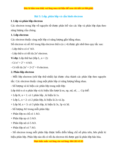 Đây là bản xem th , vu ử i lòng mua tài li u ệ đ xe ể m chi ti t (c ế ó l i ờ gi i ả ) Bài 5: L p, phân l ớ p và c ớ u hì ấ nh electron I. L p và phân l ớ p el ớ ectron Các electron trong l p ớ vỏ nguyên tử đư c ợ phân bố vào các l p ớ và phân l p ớ d a ự theo năng lư ng ợ c a chúng. ủ 1. L p el ớ ectron Các electron thu c cùng m ộ t ộ l p có năng l ớ ư ng g ợ n b ầ ng ằ nhau.