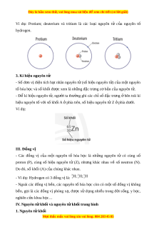 ư khác nhau về số neutron (N). Do đó, số khối (A) c a ủ chúng khác nhau. 3 2 1 - Ví d : ụ Hydrogen có 3 đ ng v ồ l ị à: H; H; H 1 1 1 - Ngoài các đ ng ồ vị b n, ề các nguyên tố hóa h c ọ còn có m t ộ s ố đ ng ồ v ịkhông b n, ề g i ọ là các đ ng ồ vị phóng x , ạ đư c ợ s ử d ng ụ nhi u ề trong đ i ờ s ng, ố y h c, ọ nghiên c u ứ khoa h c… ọ IV. Nguyên t kh ử i ố và nguyên t kh ử i ố trung bình 1. Nguyên t k ử h i ố M i ọ thắc m c