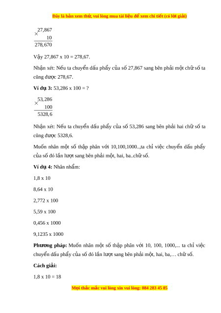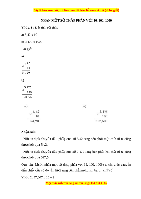 Đây là bản xem th , vu ử i lòng mua tài li u ệ đ xe ể m chi ti t ế (có l i ờ gi i ả ) NHÂN M T Ộ S Ố THẬP PHÂN V I Ớ 10, 100, 1000 Ví d 1 : ụ Đ t ặ tính rồi tính: a) 5,42 x 10 b) 3,175 x 1000 Bài gi i ả a) 5,42 10 54,20 b) 3,175 100 317,5 Nhận xét: - N u ế ta d ch ị chuy n ể d u ấ ph y ẩ c a ủ số 5,42 sang bên ph i ả m t ộ chữ số ta cũng đư c ợ k t ế qu 54,2. ả - N u ế ta d ch ị chuy n ể d u ấ ph y ẩ c a ủ số 3,175 sang bên ph i ả hai chữ số ta cũng đư c ợ k t ế qu 317,5. ả Quy t c