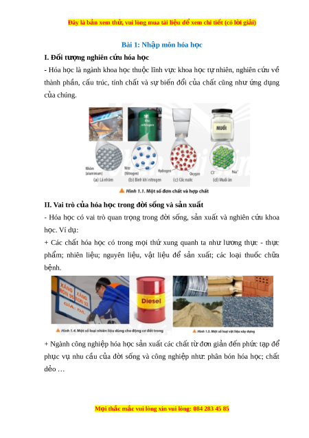Đây là bản xem th , vu ử i lòng mua tài li u ệ đ xe ể m chi ti t ế (có l i ờ gi i ả ) Bài 1: Nh p m ậ ôn hóa h c ọ I. Đ i ố tư ng nghi ợ ên c u h ứ óa h c ọ - Hóa h c ọ là ngành khoa h c ọ thu c ộ lĩnh v c ự khoa h c ọ t ự nhiên, nghiên c u ứ về thành ph n, ầ c u ấ trúc, tính ch t ấ và sự bi n ế đ i ổ c a ủ ch t ấ cũng như ng ứ d ng ụ c a chúng. ủ II. Vai trò c a hóa h ủ c t ọ rong đ i ờ s ng và s ố n xu ả t ấ - Hóa h c ọ có vai trò quan tr ng ọ trong đ i ờ s ng, ố s n ả xu t ấ và nghiên c u ứ khoa h c. ọ Ví d : ụ + Các ch t ấ hóa h c ọ có trong m i