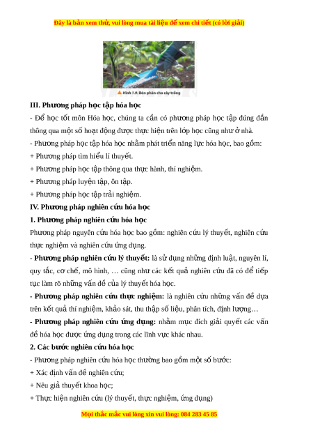 Đây là bản xem th , vu ử i lòng mua tài li u ệ đ xe ể m chi ti t (c ế ó l i ờ gi i ả ) III. Phư ng pháp h ơ c t ọ p hóa h ậ c ọ - Để h c ọ t t ố môn Hóa h c, ọ chúng ta c n ầ có phư ng ơ pháp h c ọ t p ậ đúng đ n ắ thông qua m t ộ số ho t ạ đ ng đ ộ ư c ợ th c hi ự n t ệ rên l p h ớ c cũng nh ọ ư nhà. ở - Phư ng pháp h ơ c ọ t p hóa h ậ c ọ nh m ằ phát tri n năng l ể c hóa h ự c, ọ bao g m ồ : + Phư ng pháp ơ tìm hi u l ể í thuy t ế . + Phư ng pháp ơ h c t ọ p t ậ hông qua th c ự hành, thí nghi m ệ . + Phư ng pháp ơ luy n t ệ p, ậ ôn t p. ậ + Phư ng pháp ơ h c t ọ p t ậ r i ả nghi m ệ . IV. Phư ng pháp ng ơ hiên c u hóa h ứ c ọ 1. Phư ng