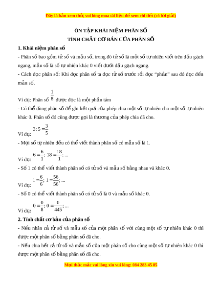 Đây là bản xem th , vu ử i lòng mua tài li u ệ đ xe ể m chi ti t ế (có l i ờ gi i ả ) ÔN TẬP KHÁI NI M P Ệ HÂN SỐ TÍNH CHẤT C B Ơ ẢN C A Ủ PHÂN SỐ 1. Khái ni m ệ phân số - Phân số bao g m ồ t ử s ố và m u ẫ s , ố trong đó t ử s ố là m t ộ s ố t ự nhiên vi t ế trên d u ấ g ch ạ
