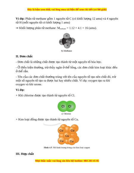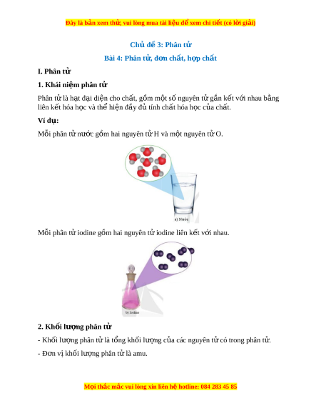 Đây là bản xem th , vu ử i lòng mua tài li u ệ đ xe ể m chi ti t (c ế ó l i ờ gi i ả ) Chủ đ 3: ề Phân tử Bài 4: Phân t , đ ử n ch ơ t ấ , h p ch ợ t ấ I. Phân tử 1. Khái ni m ệ phân tử Phân t l ử à h t ạ đ i ạ di n cho ch ệ t ấ , g m ồ m t ộ s nguyên t ố g ử n ắ k t ế v i ớ nhau b ng ằ liên k t ế hóa h c và t ọ h hi ể n đ ệ y đ ầ t ủ ính ch t ấ hóa h c c ọ a ủ ch t ấ . Ví d : ụ Mỗi phân t n ử ư c g ớ ồm hai nguyên t H ử và m t ộ nguyên t O ử . Mỗi phân t i ử odine g m