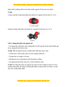 ạ hành từ 3 nguyên tố hóa h c l ọ à C, H, O. Chú ý: D ng t ạ hù hình c a nguyên t ủ ố - Các d ng ạ đ n ch ơ t ấ khác nhau nh ng đ ư u ề do m t ộ nguyên t t ố o t ạ hành đư c ợ g i ọ là các d ng t ạ hù hình khác nhau. Ví d : ụ M t ộ số nguyên tố t o r ạ a nhi u đ ề n ch ơ ất khác nhau, nh : ư + Carbon t o ạ ra than mu i ộ , than chì, kim cư ng, f ơ ullerene...; + Oxygen t o ạ ra oxygen và ozone; + Phosphorus t o r ạ a phosphorus đ , ỏ phosphorus tr ng,... ắ - Các d ng