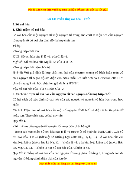 Đây là bản xem th , vu ử i lòng mua tài li u ệ đ xe ể m chi ti t (c ế ó l i ờ gi i ả ) Bài 13: Phản ng oxi ứ hóa – khử I. S oxi ố hóa 1. Khái ni m ệ s oxi ố hóa Số oxi hóa c a ủ m t ộ nguyên tử m t ộ nguyên tố trong h p ợ ch t ấ là đi n ệ tích c a ủ nguyên t nguyên ử tố đó v i