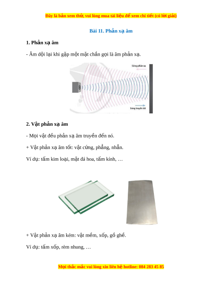 Đây là bản xem th , vu ử i lòng mua tài li u ệ đ xe ể m chi ti t (c ế ó l i ờ gi i ả ) Bài 11. Ph n x ả âm ạ 1. Phản x âm ạ - Âm d i ộ l i ạ khi g p ặ m t ộ m t ặ ch n ắ g i ọ là âm ph n ả x . ạ 2. V t ậ ph n x ả âm ạ - M i ọ v t ậ đ u ph ề n ả x âm ạ truy n đ ề n nó. ế + V t ậ ph n ả x âm ạ t t ố : v t ậ c ng, ph ứ ng, ẳ nh n. ẵ Ví d : ụ t m ấ kim lo i ạ , m t ặ đá hoa, t m ấ kính, … + V t ậ ph n ả x âm ạ kém: v t ậ m m ề , x p, g ố gh ồ . ề Ví d : ụ t m ấ xốp, rèm nhung, … M i