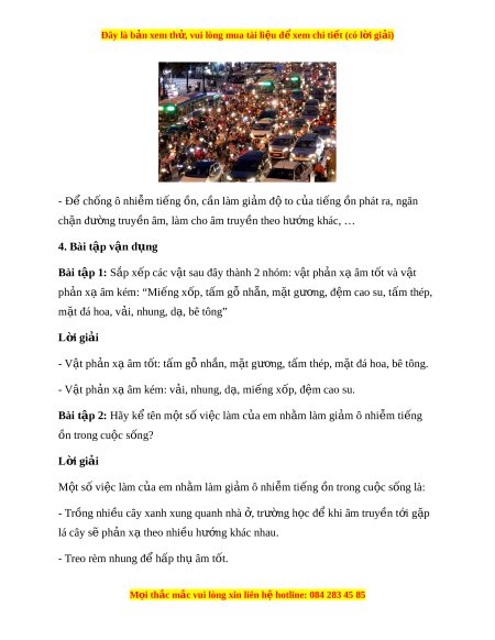 ậ sau đây thành 2 nhóm: v t ậ ph n x ả âm ạ t t ố và v t ậ ph n ả x âm ạ kém: “Mi ng x ế p, t ố m ấ g nh ỗ n, ẵ m t ặ gư ng, đ ơ m ệ cao su, t m ấ thép, m t ặ đá hoa, v i ả , nhung, d , ạ bê tông” L i ờ giải - V t ậ ph n x ả ạ âm t t ố : t m ấ g nh ỗ n, m ắ t ặ gư ng, ơ t m ấ thép, m t ặ đá hoa, bê tông. - V t ậ ph n x ả ạ âm kém: v i ả , nhung, d , ạ mi ng x ế p, đ ố m ệ cao su. Bài tập 2: Hãy k t ể ên m t ộ số vi c l ệ àm c a em ủ nh m ằ làm gi m ả ô nhi m ễ ti ng ế ồn trong cuộc sống? L i ờ giải M t ộ số việc làm c a ủ em nh m ằ làm gi m ả ô nhi m ễ ti ng ế n t ồ rong cu c s ộ ng l ố à: - Trồng nhi u cây ề xanh xung quanh nhà , t ở rư ng h ờ c ọ đ khi ể âm truy n ề t i ớ g p ặ lá cây s ph ẽ n ả x t ạ heo nhi u h ề ư ng ớ khác nhau.