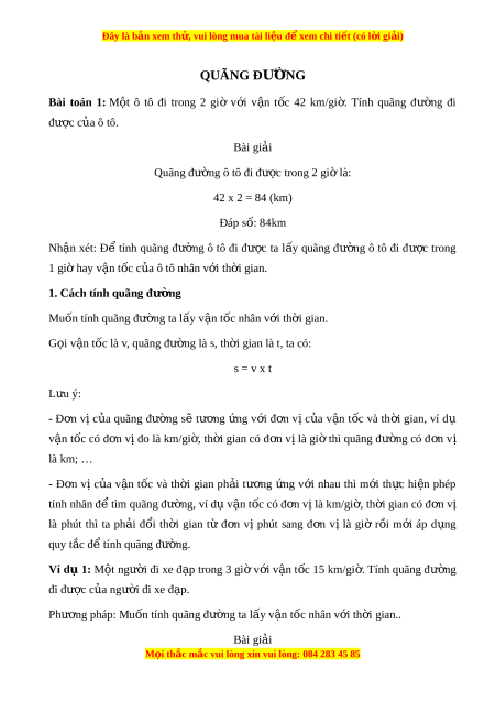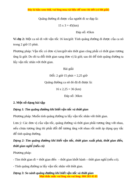 Đây là bản xem th , vu ử i lòng mua tài li u ệ đ xe ể m chi ti t ế (có l i ờ gi i ả ) Quãng đư ng đi ờ đư c ợ c a ng ủ ư i ờ đi xe đ p l ạ à: 15 x 3 = 45(km) Đáp số: 45km Ví dụ 2: M t ộ ca nô đi v i ớ v n ậ t c ố 16 km/gi . ờ Tính quãng đư ng ờ đi đư c ợ c a ủ ca nô trong 2 gi 15 phút ờ . Phư ng ơ pháp: V n ậ t c ố có đ n ơ v ịkm/gi ờ nên th i ờ gian cũng ph i ả có th i ờ gian tư ng ơ ng ứ là gi . ờ Do đó ta đ i ổ th i ờ gian sang đ n ơ v ịlà gi , ờ sau đó đ ể tính quãng đư ng ờ ta lấy v n t ậ ốc nhân v i ớ th i ờ gian. Bài gi i ả Đổi: 2 gi 15 phút ờ = 2,25 giờ