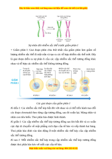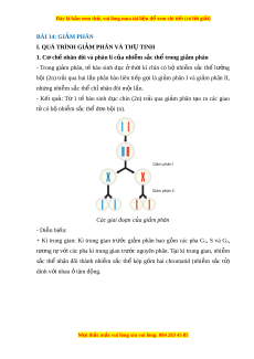 Đây là bản xem th , vu ử i lòng mua tài li u ệ đ xe ể m chi ti t ế (có l i ờ gi i ả ) BÀI 14: GI M Ả PHÂN I. QUÁ TRÌNH GI M P Ả HÂN VÀ TH Ụ TINH 1. C ch ơ nhân đôi ế và phân li c a nh ủ i m ễ s c ắ th t ể rong gi m ả phân - Trong gi m ả phân, tế bào sinh d c ụ ở th i ờ kì chín có b ộ nhi m ễ s c ắ th ể lư ng ỡ b i ộ (2n) tr i ả qua hai l n ầ phân bào liên ti p ế g i ọ là gi m ả phân I và gi m ả phân II, nh ng nhi ư m ễ sắc th ch ể ỉ nhân đôi m t ộ lần. - K t ế qu : ả T ư 1 t ế bào sinh d c ụ chín (2n) tr i ả qua gi m ả phân t o a ra cac giao t có b ử nhi ộ m ễ s c t ắ hể đ n b ơ i ộ (n). Các giai đo n c ạ a ủ giảm phân - Di n ễ bi n: ế