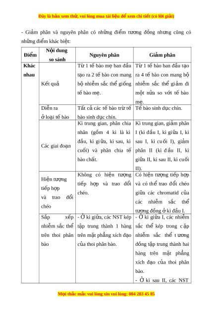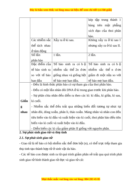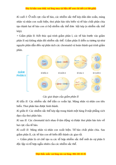 Đây là bản xem th , vu ử i lòng mua tài li u ệ đ xe ể m chi ti t ế (có l i ờ gi i ả ) Ki cuôi I: Ơ môi c c ự c a ủ t ế bào, cac nhi m ễ s c ắ th ể kép d n ầ dan xo n, ắ màng nhân và nhân con xu t ấ hi n, ê thoi phân bào tiêu bi n ế và t ế bào ch t ấ phân chia t o a thành hai t ế bào con có b ộ nhi m ễ s c ắ th ể đ n ơ b i ộ kép (n nhi m ễ s c ắ thể kép). + Gi m ả phân II: K t ế thúc qua trình gi m