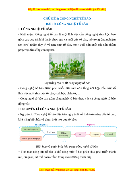 Đây là bản xem th , vu ử i lòng mua tài li u ệ đ xe ể m chi ti t ế (có l i ờ gi i ả ) CH Đ Ủ Ề 8: CÔNG NGH Ệ TẾ BÀO BÀI 16: CÔNG NGH Ệ T B Ế ÀO I. CÔNG NGH Ệ TẾ BÀO - Khai ni m