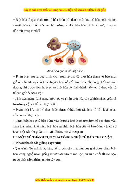 Đây là bản xem th , vu ử i lòng mua tài li u ệ đ xe ể m chi ti t (c ế ó l i ờ gi i ả ) + Bi t ê hóa là qua trình m t ộ t ế bào bi n ế đ i ổ thành m t ộ lo i ạ t ế bào m i ớ , có tinh chuyên hóa về c u ấ trúc và ch c