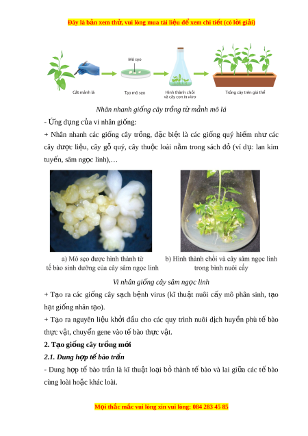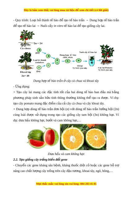 Đây là bản xem th , vu ử i lòng mua tài li u ệ đ xe ể m chi ti t (c ế ó l i ờ gi i ả ) - Quy trình: Lo i ạ b ỏ thành t ế bào đ ể t o ạ t ế bào tr n ầ → Dung h p ợ t ế bào tr n ầ đ t ể o ạ t bào l ế ai → Nuôi c y ấ in vitro t bào ế lai đ t ể o gi ạ ống cây lai. Dung h p t ợ bào t ế r n ầ