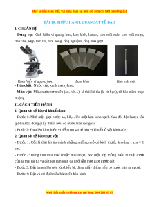 ồ ), lá thài lài tía (lá l ẻ b n) ạ , t ế bào niêm m c ạ mi ng. ệ II. CÁCH TI N Ế HÀNH 1. Quan sát t b ế ào vi khu n l ẩ am - Bư c ớ 1: Nhỏ m t ộ gi t ọ nư c ớ ao, h ,... ồ lên m t ộ lam kính s ch. ạ Sau đó, đ t ặ lamen lên gi t ọ nư c, ớ dùng gi y t ấ h m ấ n u có ế nư c t ớ ràn ra ngoài. - Bư c ớ 2: Đ a l ư ên kính hi n vi ể đ quan ể sát t bào vi ế khu n ẩ v ở t ậ kính 40×. 2. Quan sát t b ế ào th c v ự t ậ - Bư c ớ 1: C t