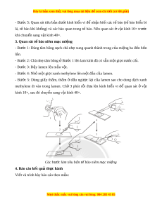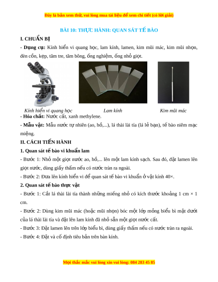 Đây là bản xem th , vu ử i lòng mua tài li u ệ đ xe ể m chi ti t (c ế ó l i ờ gi i ả ) - Bư c ớ 5: Quan sát tiêu b n ả dư i ớ kính hi n ể vi đ ể nh n ậ bi t ế các t ế bào (t ế bào bi u ể bì lá, tế bào khí kh ng) ổ và các bào quan trong t ế bào. Nên quan sát ở v t ậ kính 10× trư c ớ khi chuy n ể sang v t ậ kính 40×. 3. Quan sát t b ế ào niêm m c m ạ i ng ệ - Bư c ớ 1: Dùng tăm bông s ch ạ chà nh xung ẹ quanh thành trong c a ủ mi ng ệ ba đ n ế b n ố lần. - Bư c ớ 2: Chà nh t ẹ ăm bông B ở ư c 1 l ớ ên lam kính đã có s n ẵ m t ộ gi t ọ nư c ớ c t ấ . - Bư c ớ 3: Đ y l ậ amen lên m u v ẫ t ậ . - Bư c ớ 4: Nh m ỏ t ộ gi t ọ xanh methylene lên m t ộ đ u c ầ a l ủ amen. - Bư c ớ 5: Dùng gi y ấ th m ấ , th m ấ ở đ u ầ ngư c ợ l i ạ c a ủ lamen sao cho dung d ch ị xanh