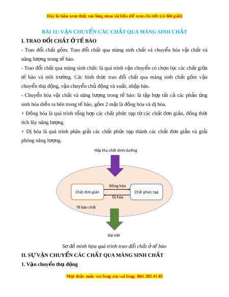 Đây là bản xem th , vu ử i lòng mua tài li u ệ đ xe ể m chi ti t (c ế ó l i ờ gi i ả ) BÀI 11: VẬN CHUY N Ể CÁC CH T Ấ QUA MÀNG SINH CH T Ấ I. TRAO Đ I Ổ CHẤT Ở T B Ế ÀO - Trao đ i ổ ch t ấ g m ồ : Trao đ i ổ ch t ấ qua màng sinh ch t ấ và chuy n ể hóa v t ậ ch t ấ và năng lư ng ợ trong t bào. ế - Trao đ i ổ ch t ấ qua màng sinh ch t ấ : là quá trình v n ậ chuy n ể có ch n ọ l c ọ các ch t ấ gi a ữ tế bào và môi trư ng. ờ Các hình th c ứ trao đ i ổ ch t ấ qua màng sinh ch t ấ g m ồ v n ậ chuy n ể th đ ụ ng, v ộ n chuy ậ n ể ch đ ủ ng và ộ xu t ấ , nh p ậ bào. - Chuy n ể hóa v t ậ ch t ấ và năng lư ng ợ trong tế bào: là t p ậ h p ợ t t ấ cả các ph n ả ng ứ sinh hóa di n r ễ a bên trong t bào, ế g m ồ 2 m t ặ là đ ng hóa và ồ d hóa. ị