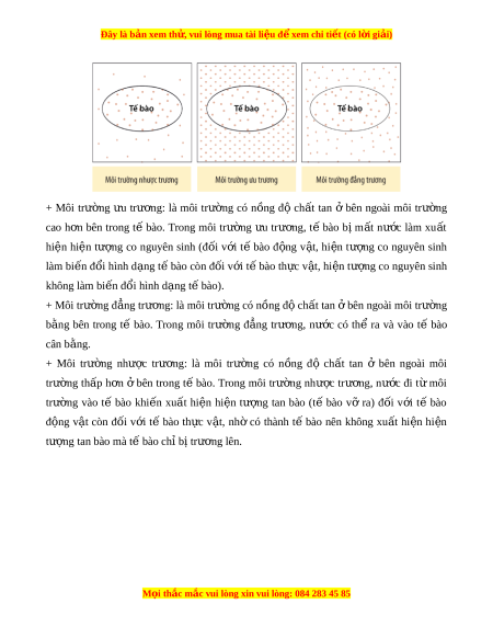 tan đóng vai trò quan tr ng nh ọ t ấ . - D a ự vào n ng ồ độ ch t ấ tan c a ủ môi trư ng ờ so v i ớ n ng ồ độ ch t ấ tan trong tế bào, ngư i ờ ta chia môi trư ng ờ thành 3 lo i ạ g m ồ môi trư ng ờ u ư trư ng, ơ môi trư ng ờ đ ng ẳ trư ng, ơ môi trư ng ờ như c ợ trư ng. ơ N ng ồ độ ch t ấ tan trong môi trư ng ờ nh ả hư ng ở đ n vi ế ệc t bào ế m t ấ nư c ớ hay h p t ấ h n ụ ư c. ớ M i ọ thắc m c