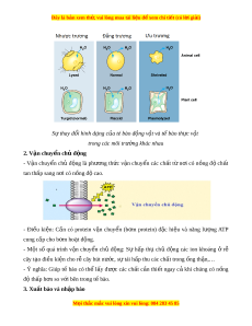 ự hay đổi hình d ng c ạ a t ủ é bào đ ng ộ v t ậ và tế bào th c ự v t ậ trong các môi trư ng ờ khác nhau 2. V n chuy ậ n ch ể đ ủ ng ộ - V n ậ chuy n ể chủ đ ng ộ là phư ng ơ th c ứ v n ậ chuy n ể các ch t ấ t ừ n i ơ có n ng ồ đ ộ ch t ấ tan th p s ấ ang n i ơ có n ng đ ồ cao. ộ - Đi u ề ki n: ệ C n ầ có protein v n ậ chuy n ể (b m ơ protein) đ c ặ hi u ệ và năng lư ng ợ ATP cung cấp cho b m ơ ho t ạ đ ng. ộ - M t ộ số quá trình v n ậ chuy n ể chủ đ ng: ộ Sự h p ấ thụ chủ đ ng ộ các ion khoáng ở rễ cây t o đi ạ u ki ề n cho r ệ cây hút ễ nư c, ớ s t ự ái h p t ấ hu các ch t ấ trong ng t ố h n,… ậ