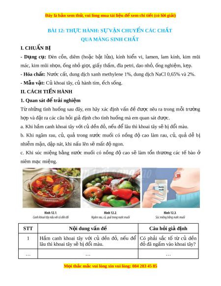 Đây là bản xem th , vu ử i lòng mua tài li u ệ đ xe ể m chi ti t (c ế ó l i ờ gi i ả ) BÀI 12: TH C Ự HÀNH: S Ự V N Ậ CHUY N Ể CÁC CH T Ấ QUA MÀNG SINH CH T Ấ I. CHUẨN BỊ - D ng ụ c : ụ Đèn c n, ồ diêm (ho c ặ b t ậ l a) ử , kính hi n