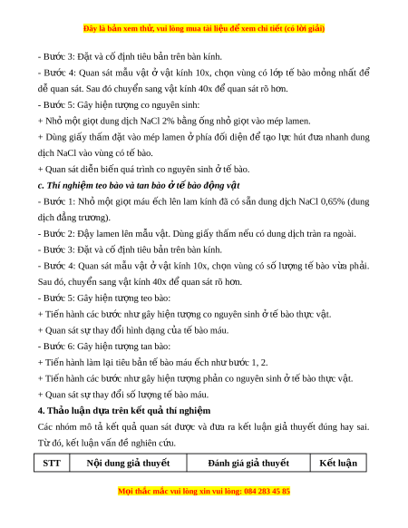 Đây là bản xem th , vu ử i lòng mua tài li u ệ đ xe ể m chi ti t (c ế ó l i ờ gi i ả ) - Bư c ớ 3: Đ t ặ và c đ ố nh t ị iêu b n ả trên bàn kính. - Bư c ớ 4: Quan sát m u ẫ v t ậ ở v t ậ kính 10x, ch n ọ vùng có l p ớ tế bào m ng ỏ nh t ấ để d quan ễ sát. Sau đó chuy n ể sang v t ậ kính 40x đ quan s ể át rõ h n. ơ - Bư c ớ 5: Gây hi n t ệ ư ng co nguyên s ợ inh: + Nhỏ m t ộ gi t ọ dung d ch ị NaCl 2% b ng ằ ng nh ố gi ỏ t ọ vào mép lamen. + Dùng gi y ấ th m ấ đ t ặ vào mép lamen ở phía đ i ố di n ệ đ ể t o ạ l c ự hút đ a ư nhanh dung