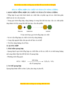 ất và tích lũy năng lư ng: ợ + Cung c p nguyên l ấ i u c ệ u t ấ o ạ nên t bào và c ế t ơ h . ể + Tích lũy năng lư ng ợ cho t bào. ế II. QUANG H P Ợ 1. Khái ni m ệ quang h p ợ - Quang h p ợ là quá trình t ng ổ h p ợ các ch t ấ h u ữ c ơ t ừ các ch t ấ vô c ơ nh ờ năng lư ng ợ ánh sáng đư c ợ h p t ấ hụ b i ở h s ệ c ắ t quang h ố p. ợ - Phư ng t ơ rình t ng quát ổ : 2. Cơ ch qua ế ng h p ợ Quang h p đ ợ ư c di ợ n r
