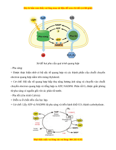 ơ ồ hai pha c a quá t ủ rình quang h p ợ - Pha sáng: + Đư c ợ th c ự hi n ệ nhờ có hệ s c ắ tố quang h p ợ và các thành ph n ầ c a ủ chu i ỗ chuy n ề electron quang h p ợ n m ằ trên màng thylakoid. + Cơ ch : ế Hệ s c ắ tố quang h p ợ h p ấ thụ năng lư ng ợ ánh sáng và chuy n ể vào chu i ỗ chuy n ề electron quang h p ợ và t ng ổ h p ợ ra ATP, NADPH. Phân t ử O2 đư c ợ gi i ả phóng t pha ừ