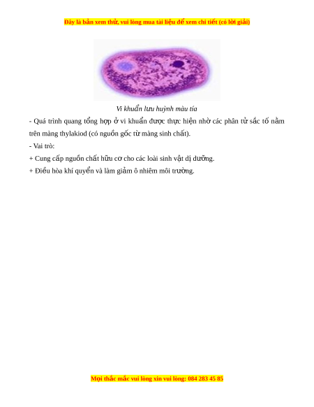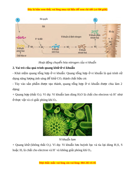 Đây là bản xem th , vu ử i lòng mua tài li u ệ đ xe ể m chi ti t (c ế ó l i ờ gi i ả ) Ho t ạ đ ng ộ chuy n hóa ni ể trogen c a ủ vi khu n ẩ 2. Vai trò c a q ủ uá trình quang kh ử vi ở khu n ẩ - Khái ni m ệ quang t ng ổ h p ợ ở vi khu n: ẩ Quang t ng ổ h p ợ ở vi khu n ẩ là quá trình sử d ng năng ụ lư ng ánh s ợ áng đ kh ể C ử O2 thành chất h u c ữ . ơ - Tùy vào s n ả ph m ẩ đư c ợ t o ạ thành, quang t ng ổ h p ợ ở vi khu n ẩ đư c ợ chia làm 2 d ng: ạ + Quang h p ợ (th i ả O + 2). Ví d : ụ Vi khu n ẩ lam dùng H2O là ch t ấ cho electron và H như ở th c ự v t ậ và có gi i ả phóng khí O2. Vi khuẩn lam + Quang khử (không th i ả O2). Ví d : ụ Vi khu n ẩ l u ư huỳnh l c ụ và tía l i ạ dùng H2S, S ho c ặ H +