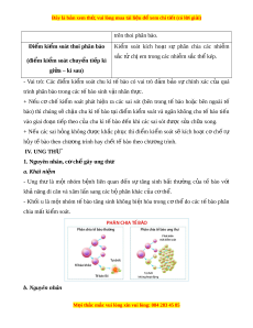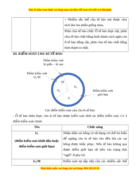 ậ , phân chia tế bào ch t ấ b ng ằ hình thành eo th t ắ . III. KI M SO Ể ÁT CHU KÌ T B Ế ÀO Các đi m ể ki m ể soát c a ủ chu kì t bào ế - Ở tế bào nhân th c, ự chu kì tế bào đư c ợ ki m ể soát nhờ các đi m ể ki m ể soát. Có 3 đi m ể ki m ể soát chính: Tên Chức năng G1 Nh n ậ di n ệ sai h ng ỏ và sử d ng ụ cơ chế tín hi u ệ để ng ng ừ chu kì tế bào cho đ n ế khi các sai (đi m ể ki m ể soát kh i ở đ u ho ầ c ặ h ng ỏ đư c ợ kh c ắ ph c. ụ N u ế tế bào không qua đi m ể ki m ể soát gi i ớ h n) ạ đư c ợ đi m ể gi i ớ h n ạ sẽ ti n ế vào tr ng ạ thái “nghỉ” ở pha G0. G2/M Ki m ể soát sự s p ắ x p ế c a ủ các nhi m ễ s c ắ thể M i ọ thắc m c