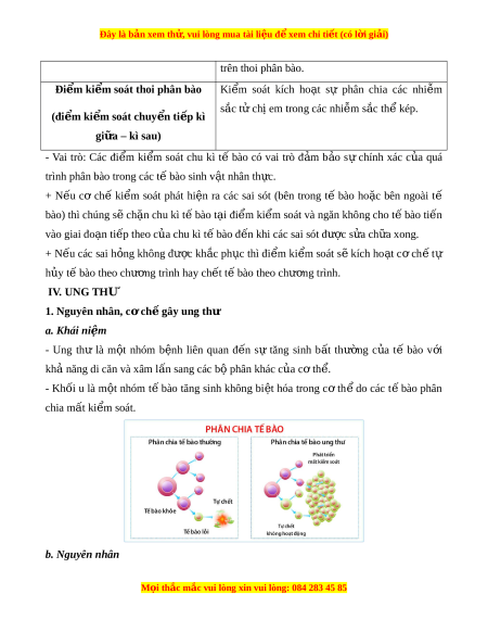 ể soát và ngăn không cho t bào t ế i n ế vào giai đo n ạ ti p t ế heo c a ủ chu kì t bào đ ế n khi ế các sai sót đư c s ợ a ử ch a xong. ữ + N u ế các sai h ng ỏ không đư c ợ kh c ắ ph c ụ thì đi m ể ki m ể soát s ẽ kích ho t ạ c ơ ch ế tự h y t ủ ế bào theo chư ng t ơ rình hay ch t ế t bào t ế heo chư ng t ơ rình. IV. UNG THƯ 1. Nguyên nhân, c ch ơ gây ung t ế hư a. Khái ni m ệ - Ung thư là m t ộ nhóm b nh ệ liên quan đ n ế sự tăng sinh b t ấ thư ng ờ c a ủ tế bào v i ớ