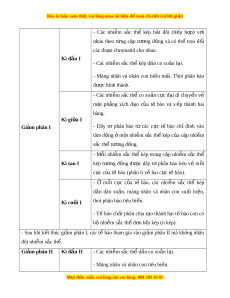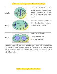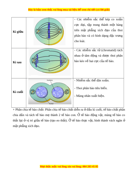 Đây là bản xem th , vu ử i lòng mua tài li u ệ đ xe ể m chi ti t (c ế ó l i ờ gi i ả ) - Các nhi m ễ s c ắ thể kép co xo n ắ c c ự đ i ạ , t p ậ trung thành m t ộ hàng Kì gi a ữ trên m t ặ ph ng ẳ xích đ o ạ c a ủ thoi phân bào và có hình d ng ạ đ c ặ tr ng ư cho loài. - Các nhi m ễ s c ắ tử (chromatid) tách nhau ở tâm đ ng ộ và đư c ợ thoi phân Kì sau bào kéo v hai ề c c c ự a ủ t bào. ế - Nhi m ễ sắc th dãn xo ể n. ắ - Thoi phân bào tiêu bi n. ế Kì cu i ố - Màng nhân xu t ấ hi n. ệ + Phân chia t ế bào ch t ấ : Phân chia t ế bào ch t ấ di n ễ ra ở đ u ầ kì cu i ố , t ế bào ch t ấ phân chia d n