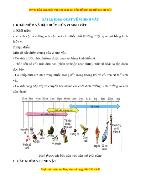 Đây là bản xem th , vu ử i lòng mua tài li u ệ đ xe ể m chi ti t (c ế ó l i ờ gi i ả ) BÀI 22: KHÁI QUÁT V Ề VI SINH V T Ậ I. KHÁI NI M Ệ VÀ Đ C Ặ ĐI M Ể C A Ủ VI SINH V T Ậ 1. Khái ni m ệ - Vi sinh v t ậ là nh ng ữ sinh v t ậ có kích thư c ớ nhỏ thư ng ờ đư c ợ quan sát b ng ằ kính hi n vi ể . 2. Đặc đi m ể M t ô sô đ c ă đi m ể chung c a vi u sinh v t ậ : - Có kích thư c ớ nh , t ỏ hư ng đ ờ ư c quan s ợ át b ng kí ằ nh hi n vi ể . - Phân l n ớ có c u ấ trúc đ n ơ bào (nhân sơ ho c ă nhân th c ự ), m t ô sô khác là t p ậ đoàn đ n ơ bào. - Có kh p ắ m i ọ n i ơ như trong nư c, ớ trong đ t