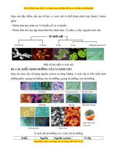 Đây là bản xem th , vu ử i lòng mua tài li u ệ đ xe ể m chi ti t (c ế ó l i ờ gi i ả ) D a ự vào đ c ă đi m ể c u ấ t o a t ê bào, vi sinh v t ậ có th ể đư c ợ phân lo i a thành 2 nhóm gôm: - Nhóm đ n bào nhân s ơ : ơ Vi khu n ẩ cô và vi khuẩn. - Nhóm đ n bào ơ hay t p ậ đoàn đ n bào nhân ơ th c ự : Vi n m ấ , vi t o ả , nguyên sinh v t ậ . M t ô sô đ i a diên vi sinh v t â III. CÁC KI U Ể DINH DƯ N Ỡ G C A Ủ VI SINH V T Ậ D a ự vào nhu c u â s ư d ng ụ ngu n ô carbon và năng lư ng, ợ vi sinh v t ậ có b n ô ki u ể dinh dư ng ỡ gôm: quang t d ự ư ng, ỡ hóa t d ự ư ng, ỡ quang d d i ư ng, ỡ hóa d d i ư ng. ỡ Vi sinh v t â t d ư ư ng va vi ơ sinh v t â d d i ư ng ơ Ki u ể Ngu n ồ Ngu n cacbon ồ Ví dụ M i ọ thắc m c