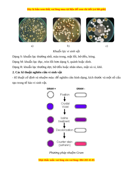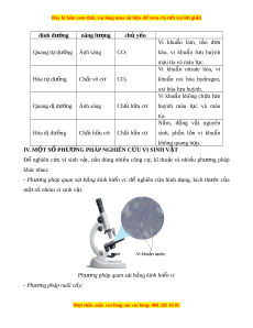 Đây là bản xem th , vu ử i lòng mua tài li u ệ đ xe ể m chi ti t (c ế ó l i ờ gi i ả ) dinh dư ng ỡ năng lư ng ợ chủ y u ế Vi khu n ẩ lam, t o ả đ n ơ Quang t d ự ư ng ỡ Ánh sáng CO2 bào, vi khu n ẩ l u ư huỳnh màu tía và màu l c. ụ Vi khu n ẩ nitrate hóa, vi Hóa t d ự ư ng ỡ Chất vô cơ CO2 khuẩn oxi hóa hydrogen, oxi hóa l u huỳnh. ư Vi khu n ẩ không ch a ứ l u ư Quang di dư ng ỡ Ánh sáng Chất h u c ữ ơ huỳnh màu l c ụ và màu tía. Nấm, đ ng ô v t ậ nguyên Hóa di dư ng ỡ Chất h u c ữ ơ Chất h u c ữ ơ sinh, ph n â l n ớ vi khu n ẩ không quang h p. ợ IV. M T Ộ S P Ố HƯ N Ơ G PHÁP NGHIÊN C U Ứ VI SINH V T Ậ Đ ể nghiên c u ứ vi sinh v t ậ , c n â dung nhi u ê công c , ụ ki thu t ậ và nhi u ê phư ng ơ pháp khác nhau: - Phư ng ơ phap quan sat b ng ằ kinh hi n ể vi: đ ể nghiên c u ứ hình d ng, a kích thư c ớ c a u m t ô sô nhóm vi sinh v t ậ . Phư ng phap quan s ơ at b ng ki ằ nh hi n vi ể - Phư ng ơ phap nuôi c y â : M i ọ thắc m c