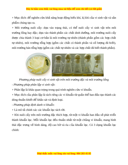 Đây là bản xem th , vu ử i lòng mua tài li u ệ đ xe ể m chi ti t (c ế ó l i ờ gi i ả ) + M c ụ đích: đ n ể ghiên c u ứ kh ả năng ho t a đ ng ô hi u ê khí, k khí i c a u vi sinh v t ậ và s n ả phẩm chúng t o a ra. + Môi trư ng ờ nuôi c y: ấ d a ự vào tr ng a thái, có thể nuôi c y ấ vi sinh v t ậ trên môi trư ng ờ l ng ỏ hay đ c ă ; d a ự vào thành ph n â các ch t ấ dinh dư ng, ỡ môi trư ng ờ nuôi c y ấ đư c ợ chia thành 3 lo i a cơ b n ả là môi trư ng ờ t ự nhiên (thành ph n â g m ô các h p ợ ch t ấ t ự nhiên), môi trư ng ờ t ng ô h p ợ (g m ô các ch t ấ có thành ph n â và s ô lư ng ợ đa bi t ê ), môi trư ng bán t ờ ông h p ( ợ gôm các ch t ấ t nhi ự ên và các h p ợ ch t ấ đa bi t ê thành ph n) â . Phư ng ơ phap nuôi c y â vi sinh v t