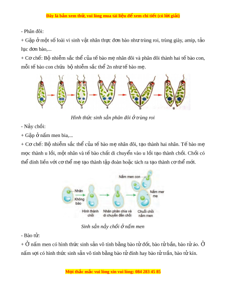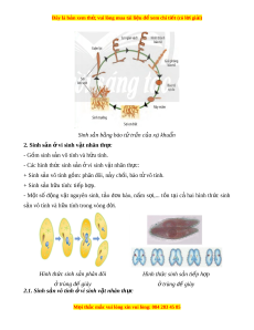Đây là bản xem th , vu ử i lòng mua tài li u ệ đ xe ể m chi ti t (c ế ó l i ờ gi i ả ) Sinh s n a b ng bao t ă t ư r n c â a u x khu a n â 2. Sinh s n ả vi ở sinh v t ậ nhân th c ự - Gồm sinh s n ả vô tinh va h u t ữ inh. - Cac hình th c ứ sinh s n ả vi ơ sinh v t â nhân th c: ư + Sinh s n ả vô tinh g m ồ : phân đôi, n y ả chồi, bao t vô t ư inh. + Sinh s n h ả u t ữ inh: ti p h ê p ơ . - M t ộ s ô đ ng ộ v t â nguyên sinh, t o ả đ n ơ bao, n m â s i ơ ,... t n ồ t i a c ả hai hình th c ứ sinh s n vô t ả inh va h u t ữ inh trong vong đ i ờ . Hinh th c s ư inh s n phân đôi a Hinh th c s ư inh s n t a i p h ê p ơ t ơ rung đ gi ê ay t ơ rung đ gi ê ay