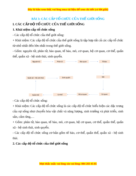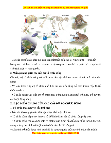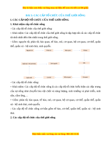 Đây là bản xem th , vu ử i lòng mua tài li u ệ đ xe ể m chi ti t (c ế ó l i ờ gi i ả ) BÀI 3: CÁC C P Ấ T C Ổ H C Ứ C A Ủ TH G Ế I I Ớ S N Ố G I. CÁC CẤP Đ Ộ T C Ổ H C Ứ C A Ủ THẾ GI I Ớ S N Ố G 1. Khái ni m ệ c p t ấ ch ổ c s ứ ng ố - Các c p đ ấ t ộ ổ ch c ứ c a t ủ h gi ế i ớ sống: + Khái ni m ệ : Các c p ấ đ ộ t ổ ch c ứ c a ủ th ế gi i ớ s ng ố là t p ậ h p ợ t t ấ c ả các c p ấ t ổ ch c ứ t nh ừ ỏ nhất đ n l ế n ớ nh t ấ trong th gi ế i ớ s ng. ố - Gồm: nguyên t , ử phân t ,