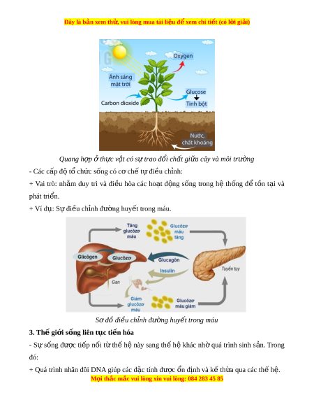 Đây là bản xem th , vu ử i lòng mua tài li u ệ đ xe ể m chi ti t (c ế ó l i ờ gi i ả ) Quang h p ợ t ở h c ự v t ậ có s t ự rao đ i ổ ch t ấ gi a cây và m ữ ôi trư ng ờ - Các c p đ ấ t ộ ổ ch c ứ sống có cơ ch t ế đi ự u ch ề nh: ỉ + Vai trò: nh m ằ duy trì và đi u ề hòa các ho t ạ đ ng ộ s ng ố trong h ệ th ng ố đ ể t n ồ t i ạ và phát tri n. ể + Ví d : ụ S đi ự u ch ề nh đ ỉ ư ng huy ờ t ế trong máu. S đ ơ ồ đi u ch ề ỉnh đư ng huy ờ t ế trong máu 3. Th gi ế i ớ s ng l ố iên t c t ụ i n hóa ế - Sự s ng ố đư c ợ ti p ế n i ố t ừ th ế h ệ này sang th ế h ệ khác nh ờ quá trình sinh s n. ả Trong đó: