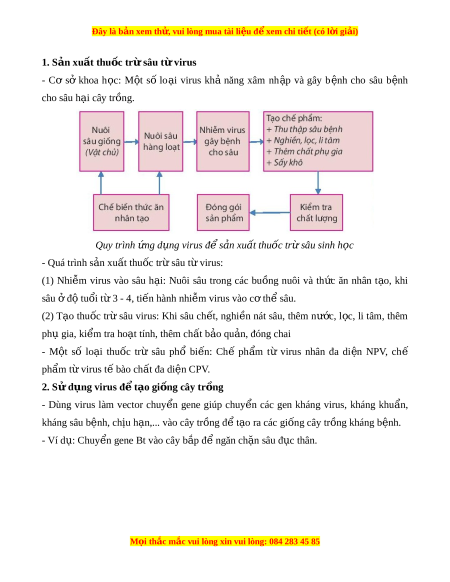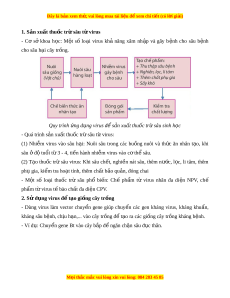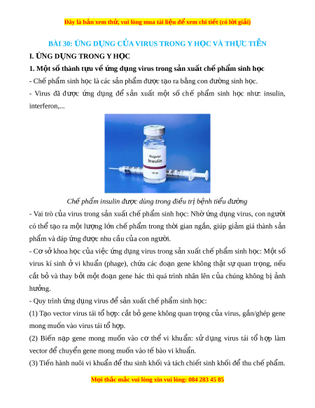Đây là bản xem th , vu ử i lòng mua tài li u ệ đ xe ể m chi ti t (c ế ó l i ờ gi i ả ) BÀI 30: N Ứ G D N Ụ G C A Ủ VIRUS TRONG Y H C Ọ VÀ TH C Ự TI N Ễ I. N Ứ G D N Ụ G TRONG Y H C Ọ 1. M t ộ s t ố hành t u v ự ề ng d ứ ng vi ụ rus trong s n xu ả t ấ ch ph ế m ẩ sinh h c ọ - Ch ph ế m ẩ sinh h c l ọ à các s n ả ph m ẩ đư c ợ t o r ạ a b ng con ằ đư ng s ờ inh h c. ọ - Virus đa đư c ợ ng ư d ng u đ ê s n ả xu t â m t ô s ô chế ph m ẩ sinh h c ọ nh : ư insulin, interferon,... Ch ph ê âm insulin đư c ơ dung trong đi u t ê r b i nh t ê i u đ ê ư ng ơ - Vai tro c a u virus trong s n ả xu t â ch ế ph m ẩ sinh h c: ọ Nh ờ ng ư d ng u virus, con ngư i ờ co th ê t o ạ ra m t ô lư ng ợ l n ơ ch ế ph m ẩ trong th i ờ gian ng n, ă giup gi m ả giá thành s n ả phẩm và đáp ng đ ư ư c nhu c ợ u c â a con u ngư i ờ . - Cơ s ơ khoa h c ọ c a u vi c ê ng ư d ng u virus trong s n ả xu t â ch ế ph m ẩ sinh h c: ọ M t ô sô virus ki sinh ơ vi khu n ẩ (phage), ch a ư các đo n ạ gene không th t â s ư quan tr ng, ọ n u ế c t ă b o và thay b i ơ m t ô đo n