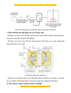 Đây là bản xem th , vu ử i lòng mua tài li u ệ đ xe ể m chi ti t (c ế ó l i ờ gi i ả ) Quy trinh ng d ư ng vi u rus đ s ê n xu a t â insulin ho c i ă nterferon 2. M t ộ s t ố hành t u ự ng d ứ ng c ụ a v ủ irus trong y h c ọ - S ư d ng u virus làm vector đ s ê n ả xu t â hormone insulin đ ê làm gi m ả n ng ô đ gl ô ucose trong máu, giup đi u t ê r b i nh t ê i u đ ê ư ng. ờ - S ư d ng u virus làm vector đ ê s n ả xu t â interferon đ ê ch ng ô virus, tăng cư ng ờ khả năng mi n d ê ich cho c t ơ h . ê Cơ ch t ê ac đ ng ô c a i u nterferon - S ư d ng u virus đ s ê n ả xu t â vaccine đ ê phong tránh các b nh ê do virus gây ra, nh ờ v y â mà con ngư i ờ co th t ê ránh đư c các ợ đ i ạ d ch, gi i up tăng cư ng ờ h m ê i n ê d ch. i II. N Ứ G D N