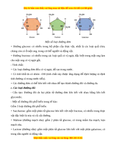 ể chung của carbohydrate - Cấu t o ạ : + Là phân t s ử inh h c đ ọ ư c ợ c u t ấ o t ạ các ừ nguyên t C ố , H, O. + Đư c ợ c u ấ t o ạ theo nguyên t c ắ đa phân. Đ n ơ phân là đư ng ờ đ n ơ (g m ồ từ 3 – 7 carbon), phổ bi n ế là đư ng 5 – 6 car ờ bon. - Tính ch t ấ : Có v ng ị t ọ , tan trong nư c và m ớ t ộ s có ố tính kh . ử - Phân lo i ạ : Tùy theo số lư ng đ ợ n