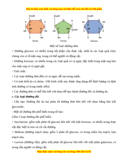 Đây là bản xem th , vu ử i lòng mua tài li u ệ đ xe ể m chi ti t (c ế ó l i ờ gi i ả ) M t ộ số lo i ạ đư ng đ ờ n ơ + Đư ng ờ glucose: có nhi u ề trong bộ ph n ậ c a ủ th c ự v t ậ , nh t ấ là các lo i ạ quả chín; chúng còn có m ở t ậ ong, trong c t ơ h ng ể ư i ờ và đ ng v ộ t ậ . + Đư ng ờ fructose: có nhi u ề trong các lo i ạ qu ả có v ịng t ọ , đ c ặ bi t ệ trong m t ậ ong làm cho m t ậ ong có vị ng t ọ g t ắ . - Tính ch t ấ : + Các lo i ạ đư ng ờ đ n ơ đ u có ề v ng ị t ọ , d t ễ an trong nư c. ớ