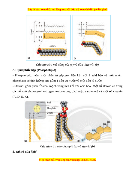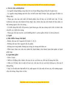 bon gồm ribose và deoxyribose). 2. Lipid a. Đặc đi m ể chung c a l ủ ipid - Đư c ợ c u t ấ o ạ t 3 nguyên t ừ chí ố nh: C, H, O. - Không c u t ấ o t ạ heo nguyên t c đa phân. ắ - Không tan trong nư c ớ nh ng t ư an trong các dung môi h u c ữ . ơ - Phân lo i ạ : D a ự vào c u ấ trúc phân t , ử lipid đư c ợ chia thành lipid đ n ơ gi n ả và lipid ph c ứ t p. ạ b. Lipid đ n gi ơ n ả - Gồm 3 lo i ạ : + Mỡ (có đ ở ng v ộ t ậ ): đư c ợ cấu t o t ạ các ừ acid béo no, tồn t i ạ t ở r ng t ạ hái r n. ắ + D u ầ (có ở th c ự v t ậ và m t ộ số loài cá): c u ấ t o